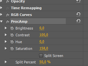 V zavihku Effects poiščite ProcAmp, ter ga povlecite v Timeline, kot v 3. koraku in nastavite parametre, kakor so na sliki.