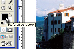 Pritisnite tipko D, da nastavite črno barvo (bela spodaj). Potem pa kliknite na izbirnik prve barve (Set foreground color). |