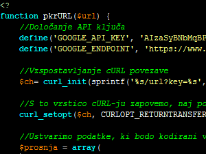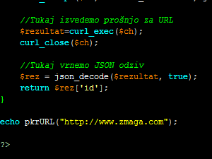 function pkrURL($url) { //Določanje API ključa define('GOOGLE_API_KEY', 'AIzaSyBNbMqBPro7A8DjVDjT6fqqfgKpCZ1TJAY'); //Sem vstavite svoj API ključ define('GOOGLE_ENDPOINT', 'https://www.googleapis.com/urlshortener/v1'); //Vzspostavljanje cURL povezave $ch= curl_init(sprintf('%s/url?key=%s', GOOGLE_ENDPOINT, GOOGLE_API_KEY)); //S to vrstico cURL-ju zapovemo, naj podatke vrne (return) namesto izpisa podatkov curl_setopt($ch, CURLOPT_RETURNTRANSFER, true); //Ustvarimo podatke, ki bodo kodirani v JSON formatu $prosnja = array( 'longUrl' => $url ); //Vrsto prošnje spremenimo v POST curl_setopt($ch, CURLOPT_POST, true); //Nastavimo kodiranje JSON curl_setopt($ch, CURLOPT_HTTPHEADER, array('Content-type: application/json')); curl_setopt($ch, CURLOPT_POSTFIELDS, json_encode($prosnja)); //Tukaj izvedemo prošnjo za URL $rezultat=curl_exec($ch); curl_close($ch); //Tukaj vrnemo JSON odziv $rez = json_decode($rezultat, true); return $rez['id']; } Če bo vse vredu, torej API ključ in URL naslov, bo skripta vrnila kratek URL naslov.