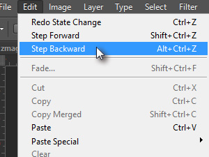 ![]() Če ponovno kliknete zgoraj na Edit, boste videli, da imate na istem mestu možno razveljavitve (Redo State Change) in je za marsikoga malo drugačen način razveljavitev kot v drugih programih. Ker pa so vsi koraki za Photoshop zelo važni, so naredili sistem z zgodovino malo drugače. Kliknite zgoraj na Edit in izberite Step Backward, da se premaknete še en korak nazaj. Lahko pa izberete možnost Step Forward, da se premaknete korak naprej.