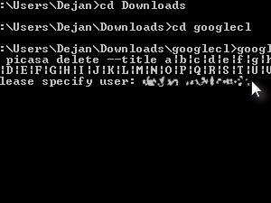 picasa delete --title a|b|c|d|e|f|g|h|i|j|k|l|m|n|o|p|q|r|s|t|u|v |w|x|y|z|A|B|C|D|E|F|G|H|I|J|K|L|M| N|O|P|Q|R|S|T|U|V |W|X|Y|Z|0|1|2|3|4|5|6|7|8|9 Vse skupaj mora biti v eni vrstici.