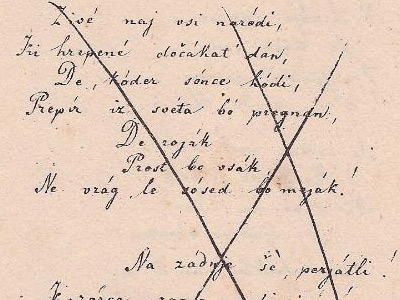 Živé naj vsi naródi, ki hrepené dočakat dan, ko, koder sonce hodi,prepir iz svéta bo pregnan, ko rojak prost bo vsak, ne vrag, le sosed bo mejak!