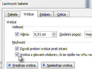 V tem zavihku označimo možnost Vrstica z glavami stolpcev, ki se izpiše na vrhu vsake strani. Potrdimo s klikom na gumb OK. |