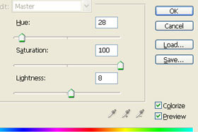 Označite Colorize. Hue nastavite 28, Saturation 100 in Lightness 8. Seveda barve lahko določate tudi poljubno. Kliknite na gumb OK. |
