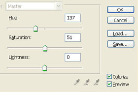 Označite Colorize. Hue nastavite 137, Saturation 51 in Lightness 0. Seveda barve lahko določate tudi poljubno. Kliknite na gumb OK. |