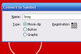 Odpre se okno Convert to Symbol. V polju Name vpišite krog, Type določite Movie clip in kliknite na gumb OK. |