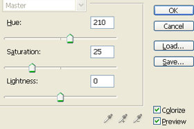 Označite Colorize. Hue nastavite 210, Saturation 25 in Lightness 0. Seveda lahko nastavljate barve po želji. Kliknite na gumb OK. |