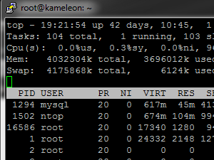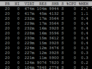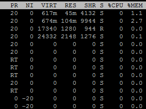 Najbolj uporabni so naslednji: CPU(s) - najlažje tu preverimo parameter %id, ki pove, koliko zmogljivosti procesorja je proste. Če ima ta parameter vrednost 0, potem je procesor polno obremenjen. Mem - tu vidimo, koliko pomnilnika se nahaja v našem računalniku ter koliko je zasedenega. |