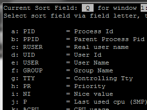 Pritisnemo kombinacijo tipko SHIFT + F. S pritiskom na ustrezno črko izberemo nov red sortiranja. Če želimo npr. sortirati procese po porabi pomnilnika, pritisnemo črko n. |