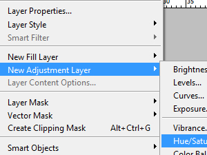 V prvem koraku izberite Layer, New Adjustments Layer in nato Hue and Saturation...