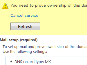 ![]() Domena je vnešena v Windows Live a še ni "aktivirana, potrebno je preveriti lastništvo domene ter vnos MX zapisov. |