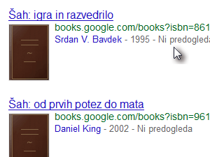![]() Podobno kot pri iskanju spletnih stran, se vam bodo izpisali razultati z najdenimi knjigami. Pri opisu knjig najdete naslov knjige, avtorja, letnico izdaje ter ali je predogled na voljo. |