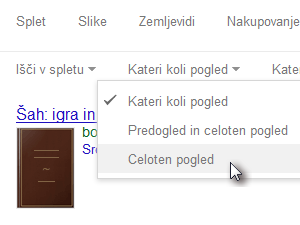 ![]() Sedaj bo iskalnik prikazal samo rezultate, kjer so na voljo knjige v celoti. V večini se tu sicer nahajajo knjige v angleščini, se pa med njimi najdejo tudi knjige v slovenščini.