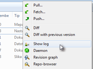 ![]() Kasneje si lahko vse spremebe in zgodovino ogledate tako, da izberete TortoiseGit -> Show log. |