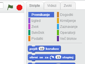 ![]() Na sredini je polje s tremi zavihki: Skripte: tukaj lahko izberate med različnimi vrstami programskih kock (glej sliko) Videzi: Vsaka figura ima lahko več videzov, ki jih preklaplja med igro. Tukaj jih lahko urejate. Zvoki: če hočete, da figura v igri predvaja zvok, ga lahko urejate in dodate tukaj. |