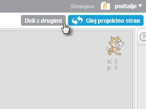 ![]() V skrajnem desnem zgornem kotu lahko delite projekt (to pomeni da ga lahko vidijo vsi) ali ga gledate preko prikazne strani (na prikazni strani lahko uredite podatke: naslov, opis, komentarje). Običajno se shrani samodejno in piše shranjeno, drugače pa lahko kliknite shrani zdaj. |