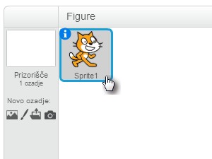 ![]() V spodnjem leven kotu je seznam figur (to so liki v vasi igrici). Ko ustvarite nov projekt je med figurami že en maček, ki ga bomo v naslednjem koraku izbrisali. 1: če hočete dodati novo figuro, jo lahko narišete, uvozite iz Scratchove knjižnice, uvozite iz računalnika ali pa iz spletne kamere. 2: Z klikom na ikono [i] se odprejo podrobnosti figure. 3: ozadje lahko dodate po enakem postopku kot figuro. |