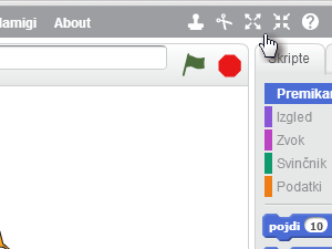 ![]() V zgornjem levem kotu se nahaja grafični vmesnik, tukaj lahko figure premikate ali igrate igro, ko jo enkrat sprogramirate. S klikom na zeleno zastavico boste zagnali igro. S klikom na rdeč stop znak pa boste vse ustavili. V levem zgornjem kotu je moder gumb, s katerim grafični vmesnik povečate čez cel zaslon. |