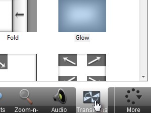 ![]() Za dodajanje mehkih prehodov izberite zavihek transitions. Potem mehki prehod povlecite na stik dveh video posnetkov. |