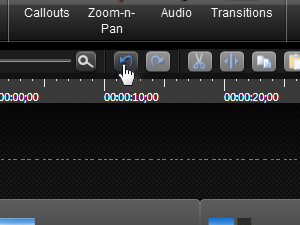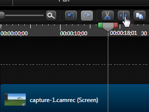 ![]() Če želite video ali zvok razrezati, najprej kliknite nanj, da ga izberete, nato premaknite kazalec časa na mesto kjer bi radi zarezali in kliknite na ikono za razrez. (glej sliko) |