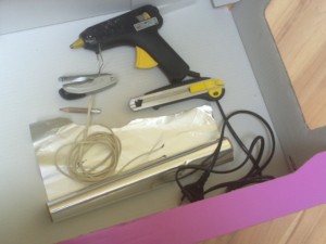 ![]() Potrebujete: Kartonsko škatlo Olfa nož Škarje Svičnik Alu-foljo Spenjač Dvo-žilna žico Pištola za vroče lepilo |