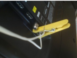 ![]() S ščipalko pritrdite drugi konec kabla na priključek za anteno zraven piše AIR/CABLE. Eno žico pripnite na zunanjo stran priključka drugo pa zataknite v luknjo n sredini. |