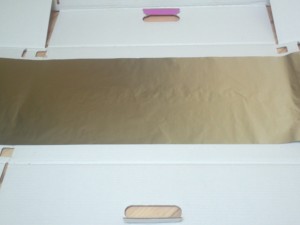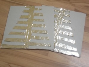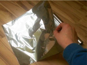 ![]() Alufolijo odvite in odrežite toliko, da znjo lahko prekrijete oba kartona potem jo po sredini zapognite nazaj. |
