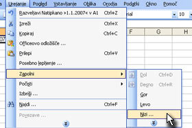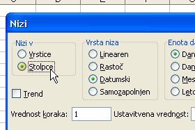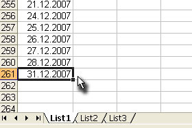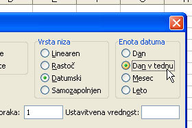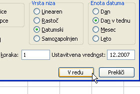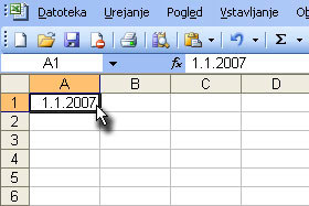 Aha...če sem že ravno pokazal zgornji način (hitrega) vpisa datumov.... morda je dela (tipkanja datumov) še manj, če datum vpišeš samo v celico A1, torej 1.1.2007 (seveda vse zgoraj napisano in tole, tule, velja ne le za datume ampak tudi za navadna števila...recimo v celico A1 vpišeš 100, v A2 101 in ponoviš, zgoraj opisani postopek)