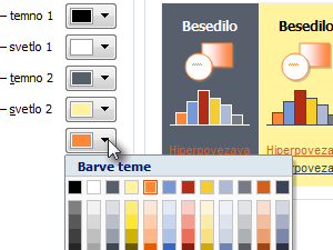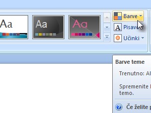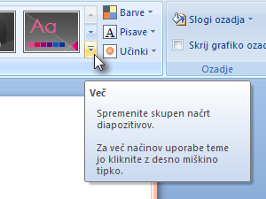 ![]() V novejših verzijah PowerPoint imate že na voljo precej barvnih tem, ki jih lahko izberete. Če si hočete ogledat vse, kliknite gumb s črtico in trikotničkom. |