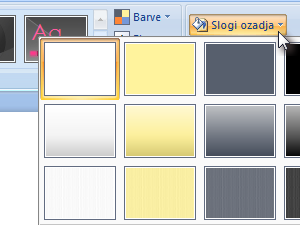 ![]() Za menjavo ozadja kliknite gumb Slogi ozadja. Lahko izberete enga izmed predpripravljenih slogov, lahko pa tudi kliknete gumb Ozadje oblike ... in za ozadje nastvite svojo barvo ali sliko. |