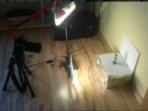 ![]() Ko je figura izdelana, se lotite postavitve malega studija. Papir upognite, da dobite kot 90°. Na papir lahko narišete ozadje zgodbe. Oder osvetlite z lučmi. Fotoaparat postavite na stojalo in ga močno pritrdite, da se med slikanjem ne bo premikal. |