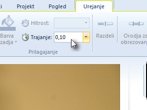 ![]() Označite vse slike (ko jih uvozite, se avtomatsko označijo). Odprite zavihek Urejanje in nastavite čas trajanja ene slike na 0,10s. (to pomeni da bo program prikazal 10 slik na sekundo ker je 0,10s*10=1s ). |