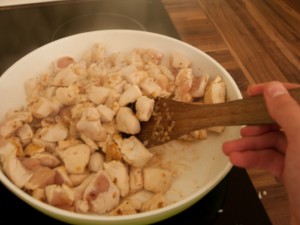 Dodajte narezano meso in počakajte da postane belkaste barve.