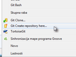 ![]() Mapo bomo sedaj spremenili tako, da bo v njej mogoče shranjevati projekte GIT iz neke druge lokacije. Z desnim miškinim gumbom kliknite na mapo in izberite možnost Git Create repository here... |
