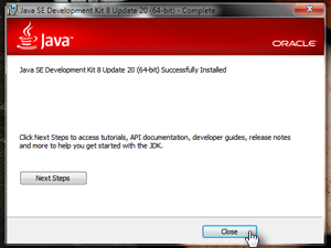 ![]() Ko se konča pritisnite Close. To je vse, uspešno ste namestili JDK. V naslednjih lekcijah pa vam bom pokazal, kako naredimo prvi program. |