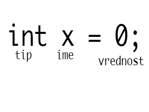 ![]() Ustvarjane spremenljivke int x = 0; int = tip spremenljivke x = ime spremenljivke 0 = vrednost spremenljivke, če spremenljivki ne določimo vrednosti (int x;) ji Java doda privzeto. Vsako vrstico v Javi končamo s podpičjem. |