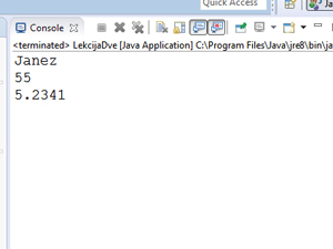 ![]() Primer uporabe spremenljivk: public class LekcijaDve {