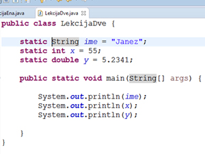 static String ime = "Janez"; static int x = 55; static double y = 5.2341;