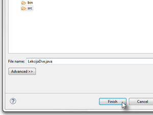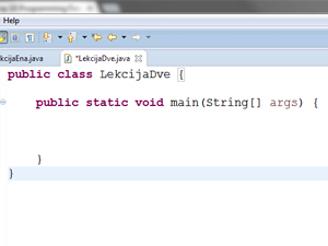 ![]() Najprej bomo naredili novo datoteko, tako kot v prejšnji lekciji. Jaz sem jo poimenoval LekcijaDve.java. |