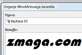 Določite poljubno pisavo. Jaz sem določil pisavo, imenovano Bauhaus 93. Potem pa v polje Besedilo vpišite poljubno besedilo. Kliknite na gumb V redu. |
