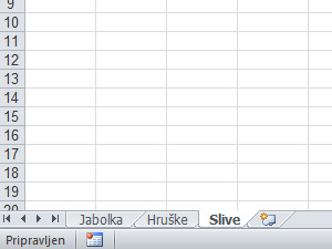 ![]() V mojem primeru imem tri liste v Excelu. Prvi list so Jabolka, drugi Hruške in tretji Slive.