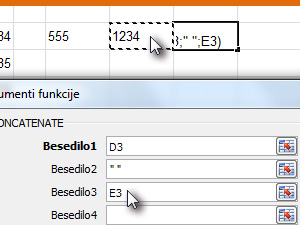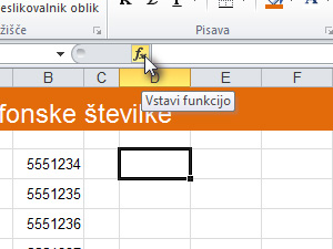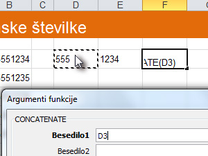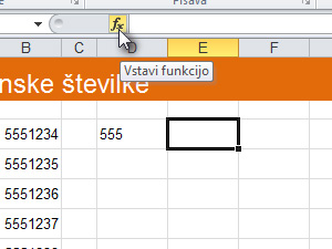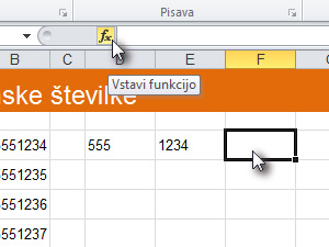 ![]() Torej, v prvi celici sem prikazal prve tri znake, v drugi zadnje štiri. Sedaj ju bom združil, vmes pa dodal presledek. Označite prazno celico na desni (glej sliko) in kliknite na Vstavi funkcijo. |