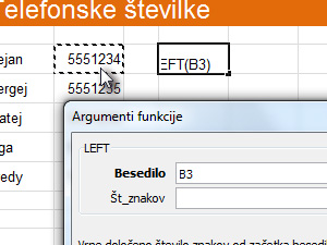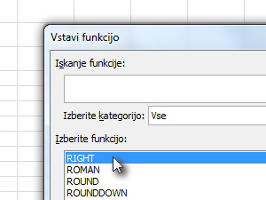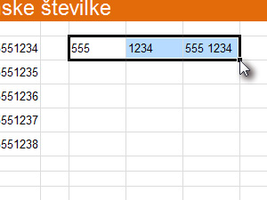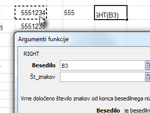![]() V prvi celici smo določili število znakov, ki se prikažejo iz leve strani. Sedaj bomo določili še iz desne. To velja le za številke oziroma celice, ki imajo isto število znakov. Označite prazno celico desno (glej sliko). |
