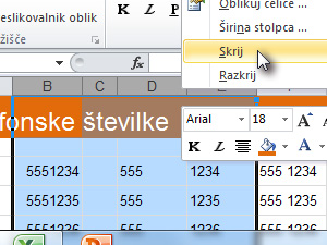 ![]() Potem v označene črke stolpcev kliknite z desnim miškinim gumbom in izberite Skrij. |