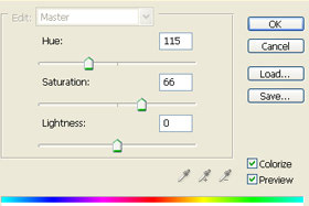 Označite Colorize in se igrajte z drsniki za določanje barv. Jaz sem Hue nastavil 115, Saturation 66 in Lightness 0. Kliknite na gumb OK. |