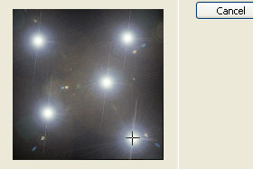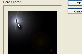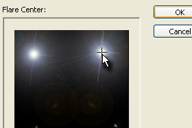 Kliknite zgoraj na Filter, Render in izberite Lens Flare... Kliknite v oknu Flare Center na drugo poljubno lokacijo (glej sliko), da ustvarite še drugi sijaj. Kliknite na gumb OK. |