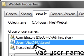 Nato v okencu Properties kliknete zavihek (zgoraj) "Security" in v spodnjem izbirnem polju izberete "Users(uporabnik-PCusers)".