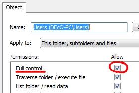 No s tem se vam v spodnjem izbirnem oknu pokažejo nastavitve mape in vi morate nastaviti mapo na "Full Control" (označeno z kljukico ali brez).