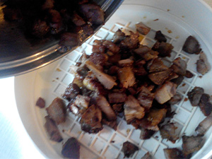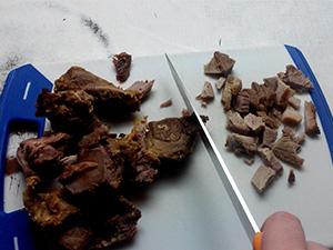 Za začetek si bomo pripravili vse potrebne sestavine, da nas med kuho ne bo prehiteval čas. Najprej narežemo meso na manjše koščke.Uporabite lahko katerokoli meso (svinjina, puran...). V mojem primeru sem uporabil govedino, ki je ostala od kosila. Lahko uporabite surovo meso ali pa že pečeno oz. kuhano. |