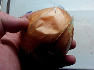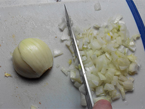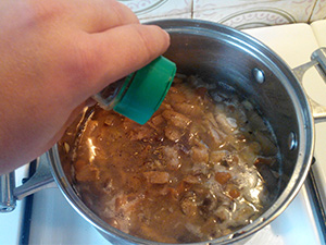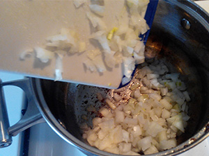 V lonec vsujemo narezno čebulo in jo prepražimo. |